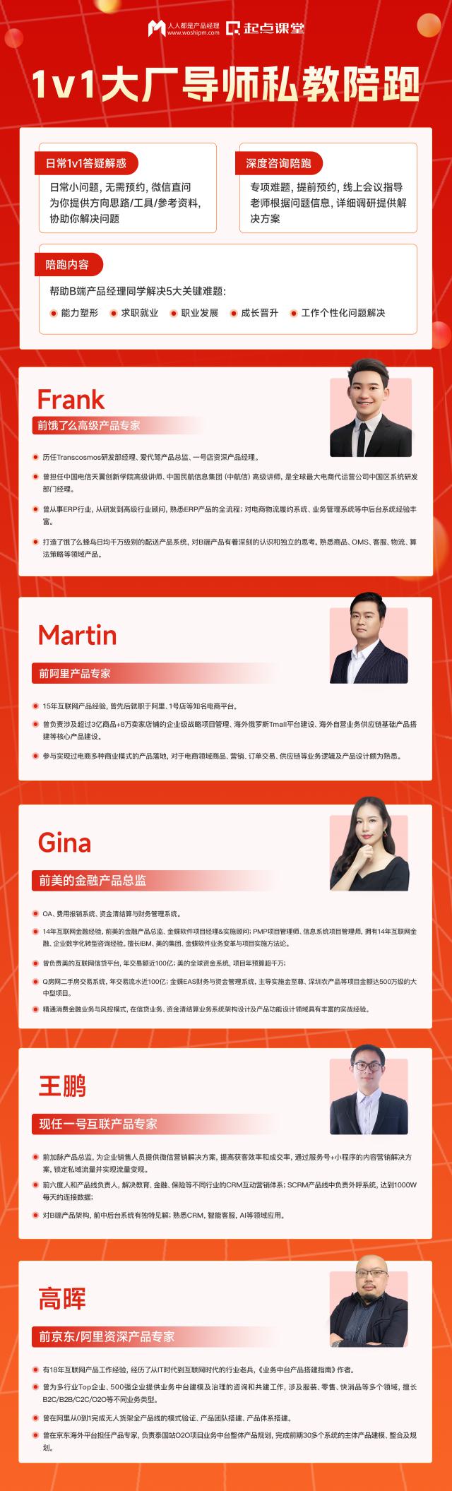 整个陪跑计划特邀多名陪跑计划 10 年 有经验的大厂导师 1v1 陪同跑步。教师还在一线业务中做产品,掌握前沿专业知识,行业机遇: