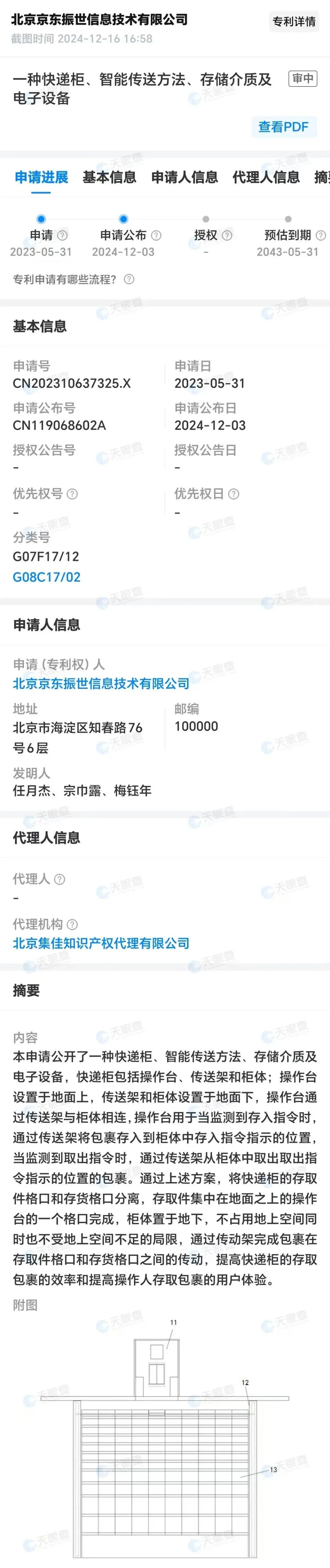 天眼查信息显示,JD.COM已于2023年申请智能柜相关专利,专利名称为“智能柜、智能传输方式、存储设备及电子产品”,公开号为CN119068602A。