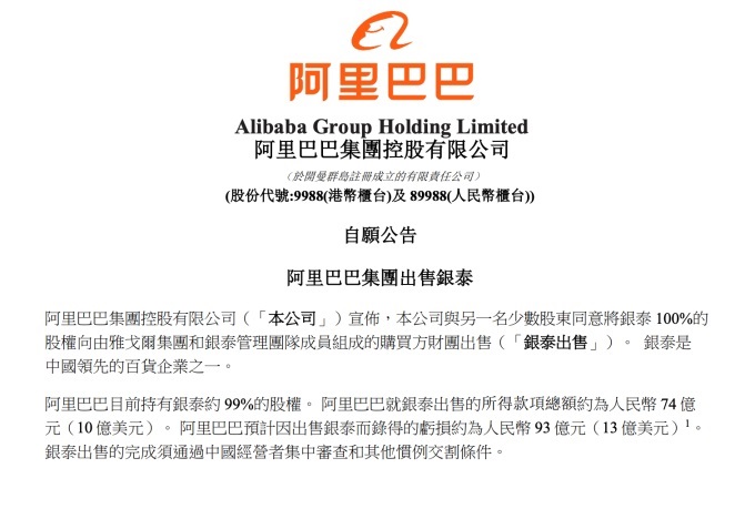 易主雅戈尔银泰百货,阿里74亿元出售银泰百货股份