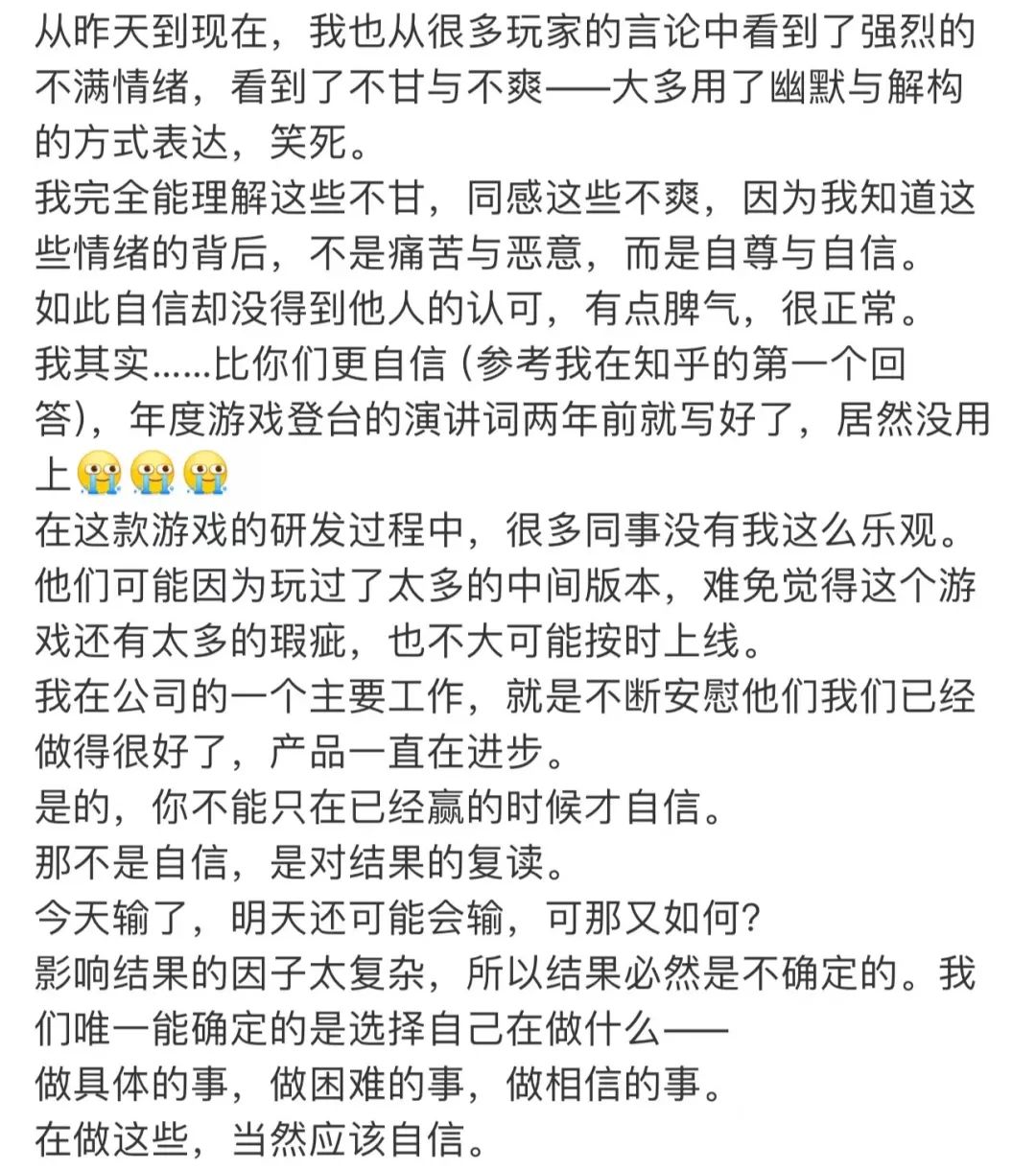 活动结束后的第二天,游戏科学创始人冯邈发布了一条长长的微博来回应这件事。虽然一开始“失落和遗憾”是豁达的,但“放下想象”可能是发自内心的说法。