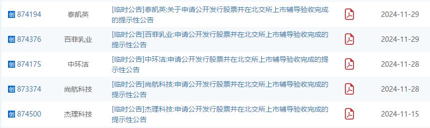 据统计,11月份,北交所上市辅导验收的新三板企业有5家,但目前只有泰凯英(874194)获得北交所上市申请材料。