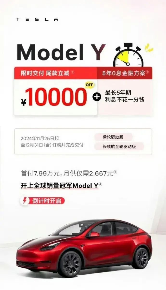 “Model Y限时交付尾款减少1万元,叠加5年零利率政策。11月25日,特斯拉在今年5次官方售价下跌后,针对12月份推出了新一波优惠促销政策。