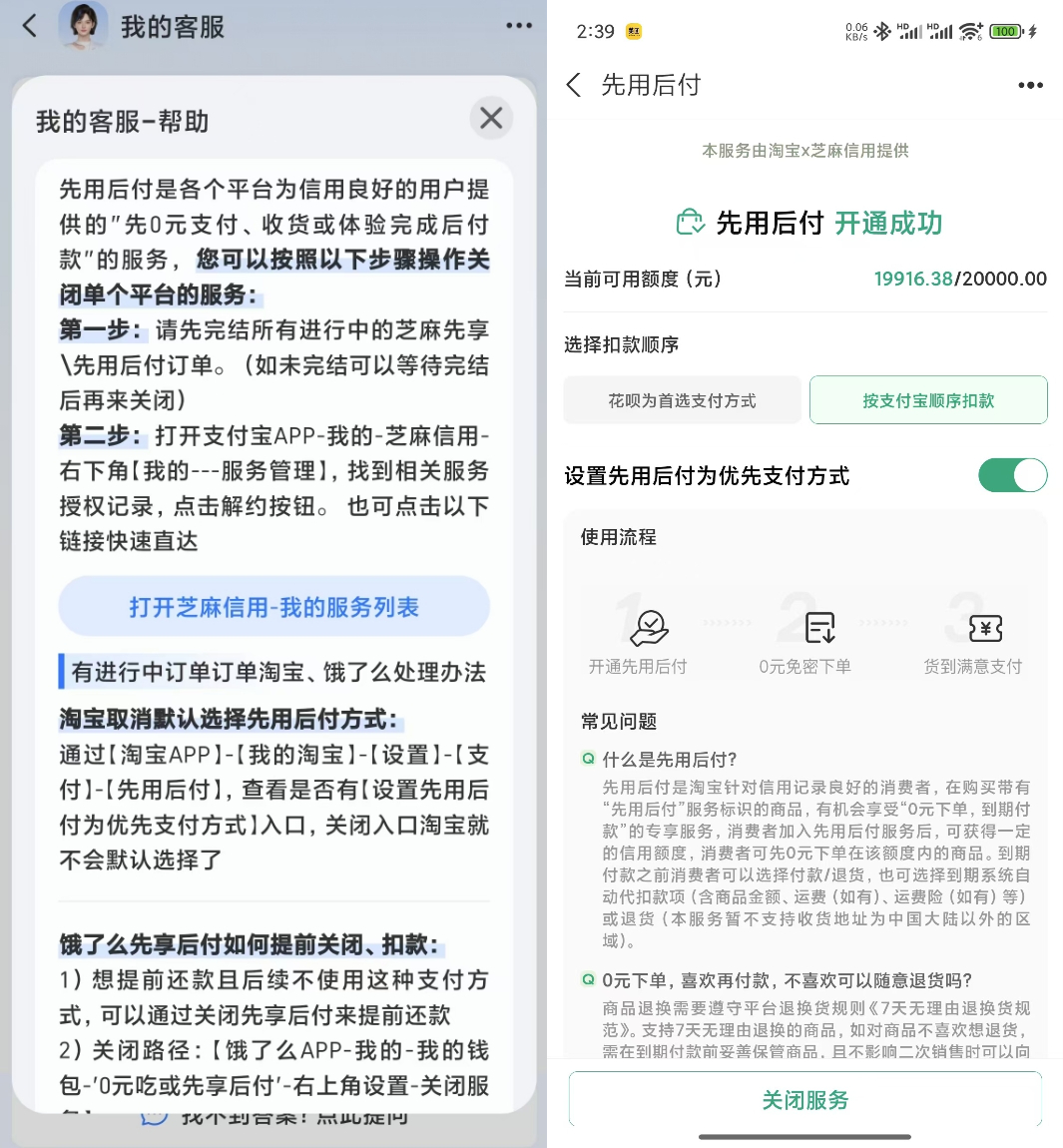 关于这个问题,咨询了支付宝客服后,很快就找到了消除的方法。首先,确保您的所有“芝麻先享受/先用后付”订单已经完成,然后打开芝麻信用。您可以在右下角的“我的-服务管理”中找到服务授权记录。如果您找到“先用后付”的授权并打开,您可以解除授权。这时,您的先用后付服务将被停止。