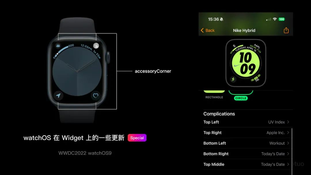 苹果在表盘上为手表屏幕的每一个角落设计了独特的功能,这就是所谓的「accessory Corner」。根据表盘的不同,有很多渲染方法,有时是平的,有时是为了与刻度表相匹配而显示弯曲。