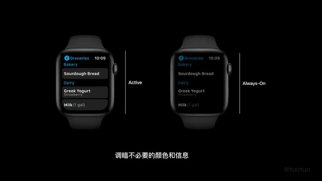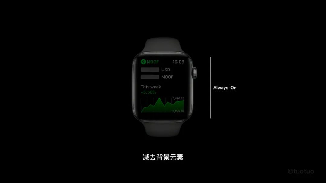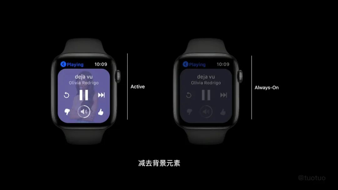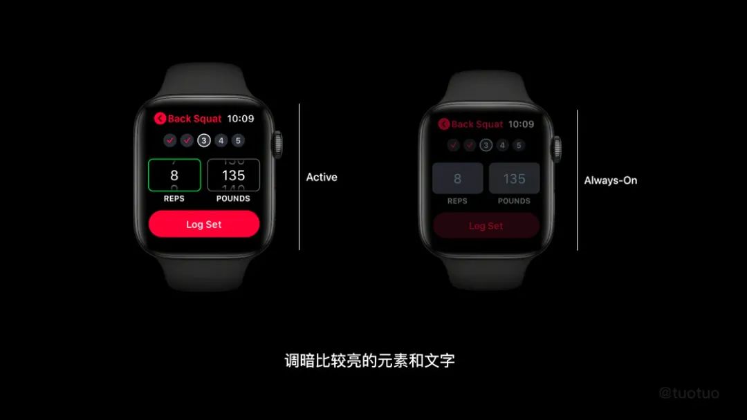 苹果在 watchOS 8 在中间增加了一个功能——Always-On Display,总是显示出来。顾客不必每次抬起手腕,都能看到表盘的基本信息。新增该功能的苹果设计原则如下:从「激活使用情况」切换为「始终显示状态」,应该让人看不见,并非大幅度地改变界面或重组信息,否则从始终显示到激活运行状态都会变成卡卡。