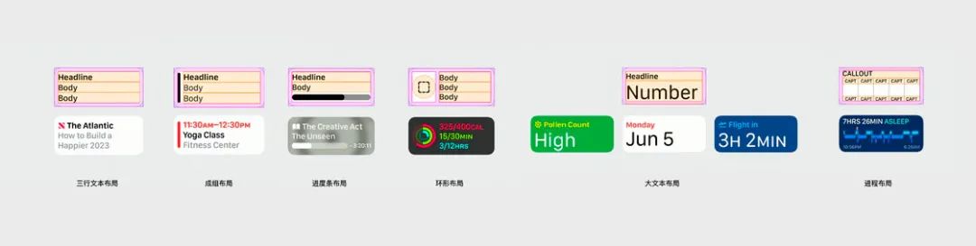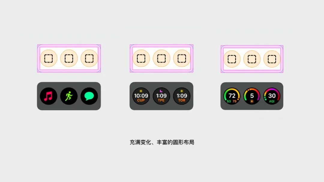 苹果做了三种不同的布局,以使不同的内容适应屏幕,并能自动适应不同大小。 Apple Watch: