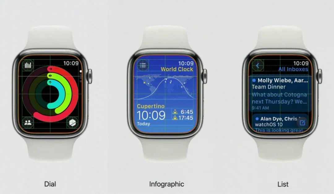 表盘形状和界面弧度更加圆润。为了一目了然,苹果更新了一种新的布局方式:基于屏幕形状的新系统决定了控制、标签和内容的大小和位置,这使得 app 布局更加统一,控制更加清晰。