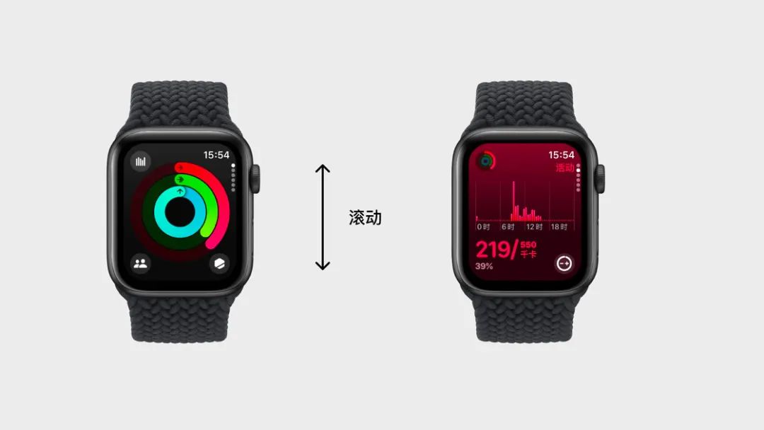 而且有很多界面 App,苹果新增了一种新的导航模式-垂直分页。例如「健身记录」,使用旋钮,可以看到健身记录的总览和活动、站立和运动环的细节,以及不同视图的转换。垂直分页将 App 其中多个信息视图分割成针对特定用途的不同页面,同时也有页数指示仪用于指示当前页面的位置。