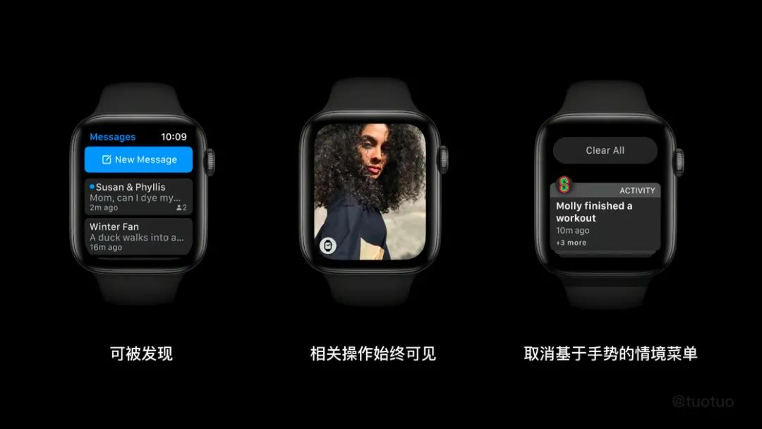 苹果发现,用户对智能手表的交互耐心最多只有 10 秒,因此传递简洁明了的信息-举手可得,并在小屏幕上具有操作性强的交互技术。,便是 Apple Watch 多年来设计的重点。不管更新了多少代表,所坚持的设计原则来来回回 回到这里,从来没有什么大的变化。