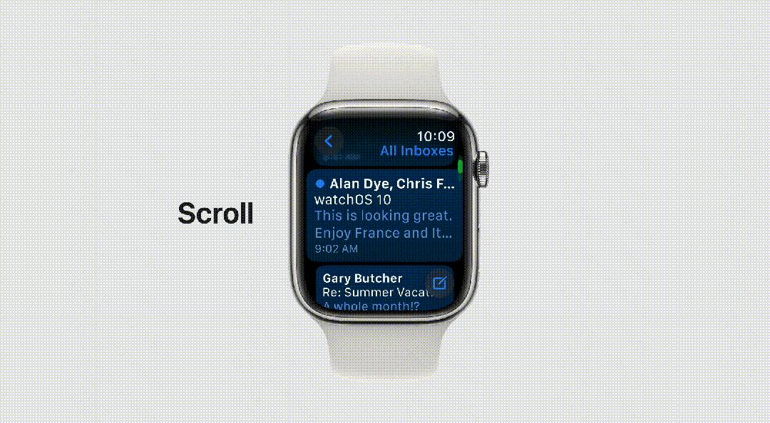 适用于 Apple Watch Series 9 以及后续型号和 Apple Watch Ultra 2 可以用来滚动浏览的互点几下手势「信息」「邮件」或「天气」等任何 App,单手模式更加方便。