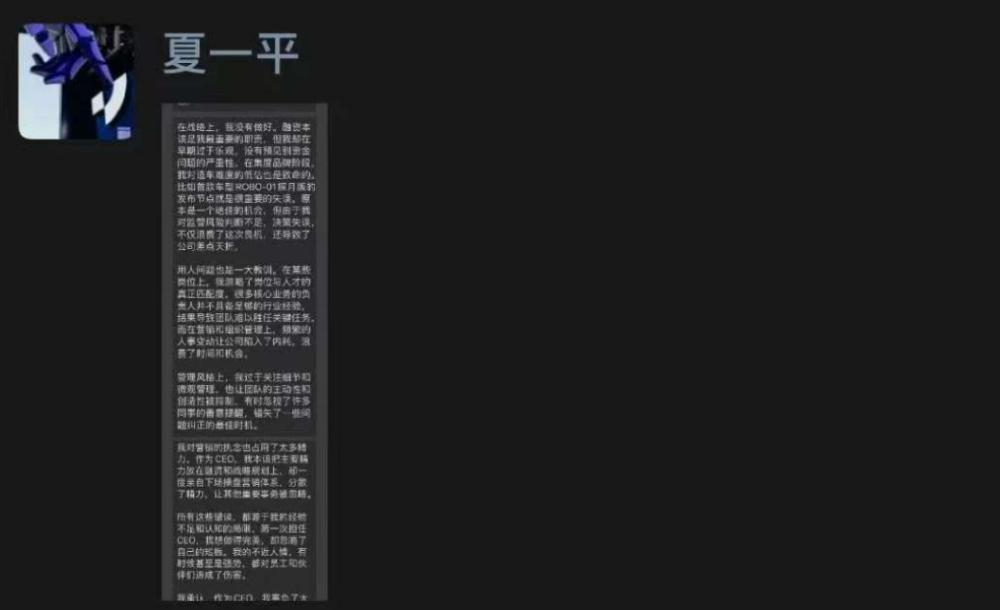 夏一平还指出了自己的问题,他指出:“在战略上,我没有做好。融资应该是我最重要的职责,但是我在初期过于乐观,没有预见到资金问题的严重性。在集中品牌阶段,我对造车难度的低估也是致命的。举例来说,首款ROBO-01探月版的发布节点是一个非常重要的错误。本来是个绝佳的机会,但是因为我对监管风险的判断不够,决策失误,不但浪费了这个机会,而且导致企业几乎死亡。”