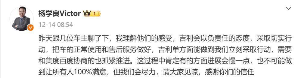 随后,12月14日,吉利控股集团高级副总裁杨学良在社交平台上发文称,吉利将做好汽车的正常使用和售后服务,吉利可以单方面立即付诸行动,需要与集中百度协商的也将迅速推进。