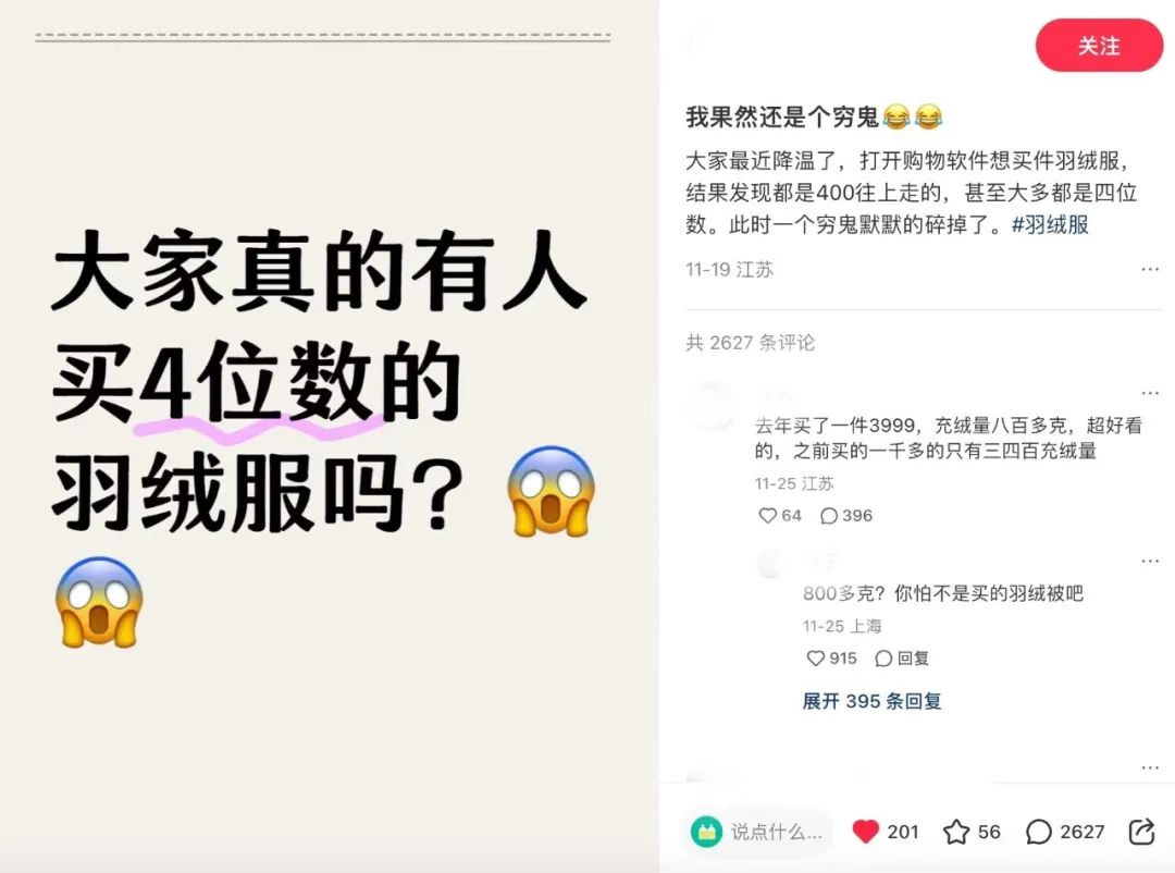 这里所谓的“贵”,并不是绝对意义上买不到羽绒服,而是作为冬装之一,大部分人对羽绒服的理想价格还没有达到“几千”。