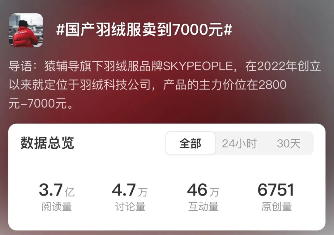 猿人辅导旗下的SKYPEOPLE,羽绒服售价7000元,而科技面料、高档羽绒原料、终身免费护理服务是支撑高价的卖点。