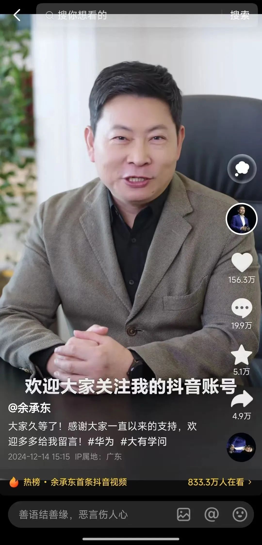 AI蓝媒汇注意到,12月12日,余承东在抖音开通账号,当天“余承东在抖音落户”的话题直接冲上了抖音热榜第一。十二月十四日,余承东发布了第一个视频,这个视频也在当天的抖音热榜上名列第一。截至目前,已获得800多万人观看、156万赞、近20万评论。