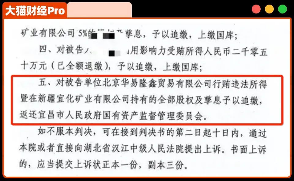 判决书最终确定:华易隆鑫贿赂非法所得及宜化矿业全部股权及滋润,退还宜昌国有资产。