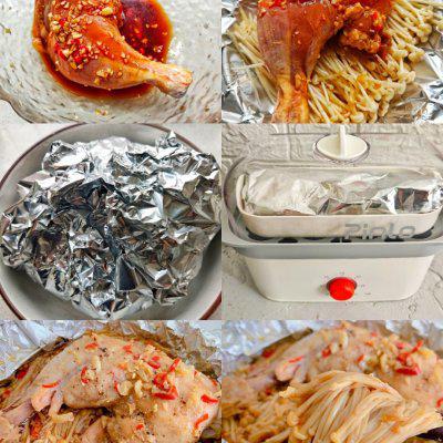 2、加入适量的盐、蒜末和小米椒。充分按摩均匀,腌制半小时以上。金针菇去根后清洗干净,金针菇放在锡箔纸上,腌制好的鸡腿放在里面。放在里面 Pinlo 小蒸锅蒸 20 可以在几分钟内出锅。