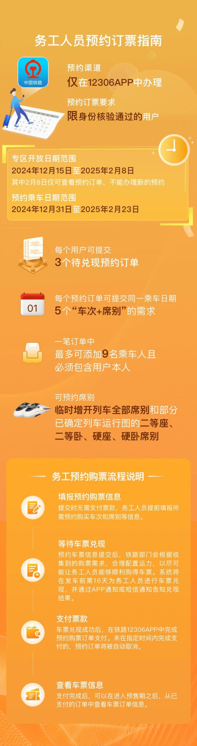 ●农民工可以在开车前17天(含)以上提交预约购票需求,最迟可以在2025年2月23日预约购票;