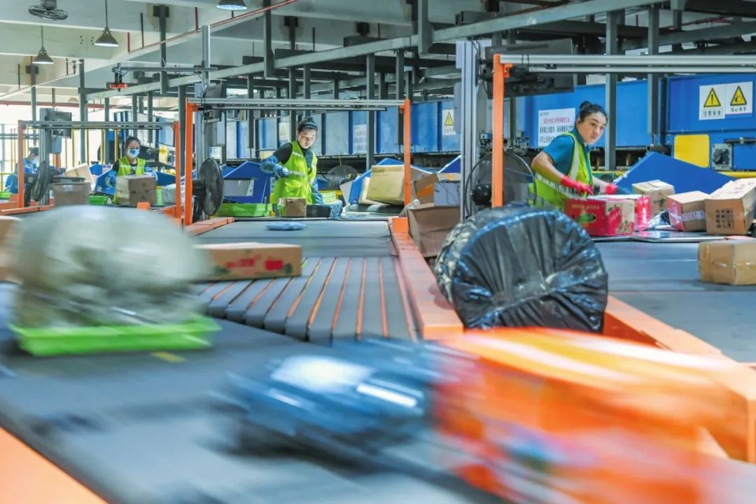 十二月十二日,在中国邮政集团有限公司海口邮区中心包件车间,工作人员将包裹放入全自动分拣机。孙士杰 摄