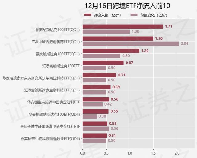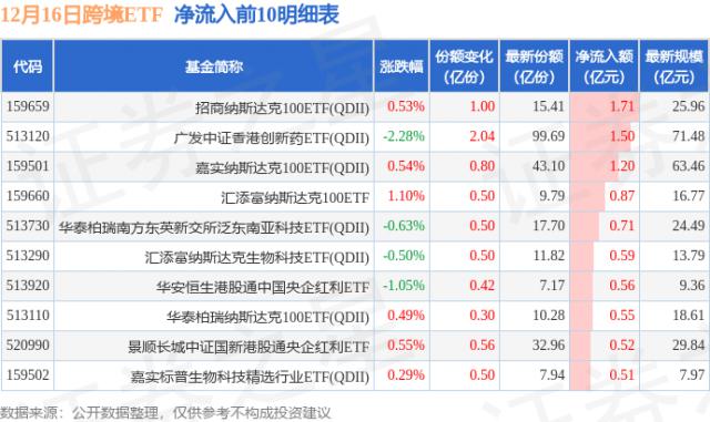 当天有 56 只跨境 ETF 资金净流入显示,其中净流入排名第一的是招商纳斯达克 100ETF ( QDII ) (159659),份额增加 1.0 十亿份,净流入额为 1.71 亿元。