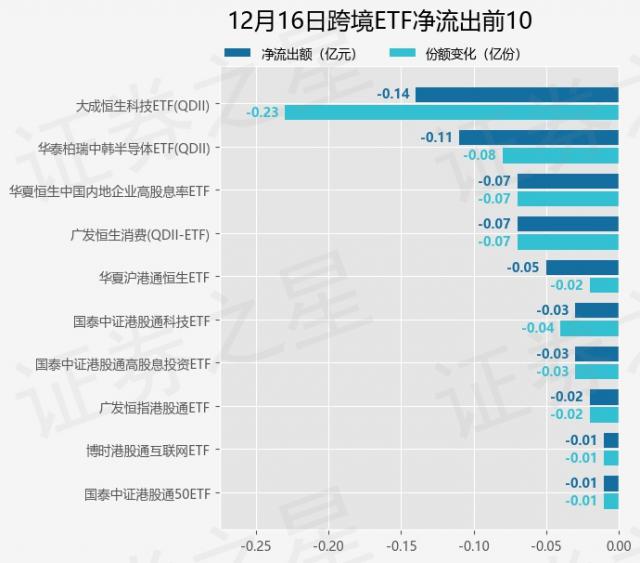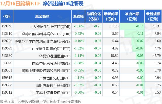 当天有 13 只跨境 ETF 资金净流出出现在基金中,其中大德恒生科技排名第一。 ETF ( QDII ) (159740),份额下降 2300.0 万份,净流出额为 1377.21 万元。