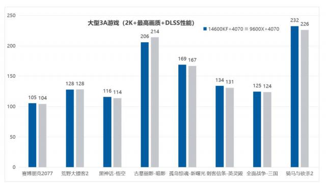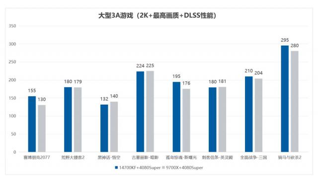 当然,从细节上来说,即使是主流玩家的选择,Intel 和 AMD 平台在 2K 由于在分辨率下的表现仍然存在差异, 2K 比较敏感的游戏内存带宽,14 代酷睿一般优于锐龙平台,即使内存频率相同,也是如此。 Intel 平台更强。根据实际测量结果,i5 14600KF RTX 4070 的 2K 综合性游戏性能要小胜 R5 9600X RTX 4070 有些,同样,i7 14700KF RTX 4080 SUPER 的 2K 综合游戏性能也要小胜利 R7 9700X RTX 4080 SUPER。当然,我们也能看到,甚至 i5 14600KF RTX 4070 这种组合,还能保证主流游戏在 2K 在高画质设定下跑到100帧以上,让玩家同时拥有流畅的游戏速度和更精美的游戏画面, i7 14700KF RTX 4080 SUPER 性能更强,感觉也会更好,适合要求更高的玩家。但是,如果对比同级别,Intel 平台与 AMD 事实上,平台差距并不大,提供的游戏体验自然也不会差很多,玩家也可以根据自己的喜好来选择。