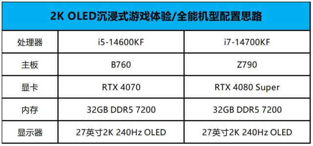 而且从之前的检测可以看出,i5 14600KF RTX 4070 这种组合能为玩家提供出色的组合。 2K 沉浸式游戏体验,不但可以在主流 3A 在游戏大作中实现 100fps 流畅度,还可以提供高画质的精美游戏画面。而且从整体装备来看,酷睿 i5 14600KF B760 主板 RTX 4070 32GB DDR5 7200 内存 2K OLED 240Hz 高刷显示器也是一种很平衡的设备,应付五年内的游戏大作不会有任何压力,的确是一种很实用的高能装机组合。当然,对于预算更充足的玩家,建议考虑一下。 i7 14700KF RTX 4080 Super 搭配,不但可以 2K 在高画质下提供 150fps 电子竞技级帧率,甚至可以在适度的设置下畅玩。 4K 游戏。