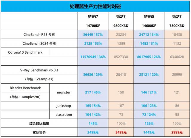 从表中可以看出,在生产力性能方面,i7 14700KF 比 R7 9800X3D 高出了 29%~平均值领先57% 45% 而且实际售价只有锐龙。 7 9800X3D 不到一半;酷睿 i5 14600KF 同时,生产力也领先于锐龙 7 7800X3D 大概 26%的价格也只有后者的价格。 48%。