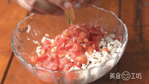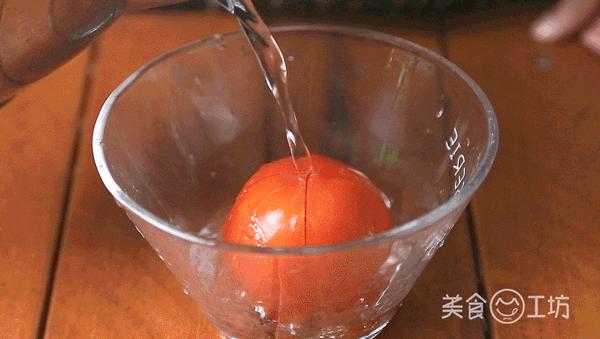 1. 将十字刀划在番茄的顶部,倒入热水烫皮。