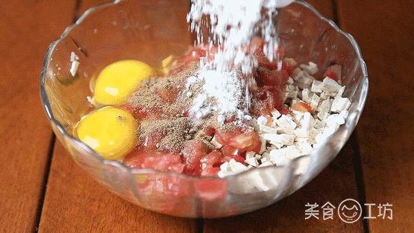 3. 将两个鸡蛋放入切好的食材中。