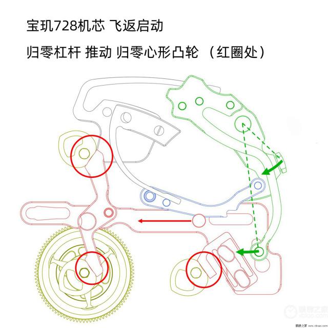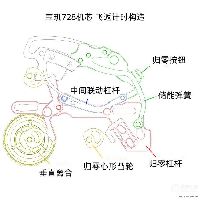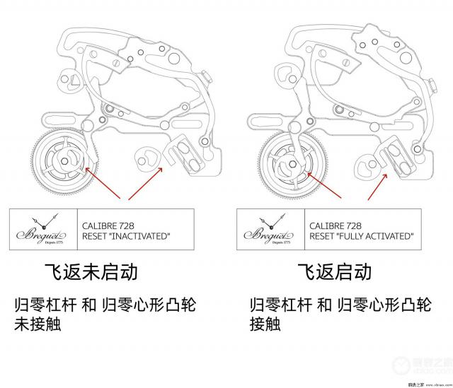 除这些技术指标外,宝玑 728 在机芯结构上,自动计时机芯还有一个重要的创新,采用了一种全新的飞回机构。