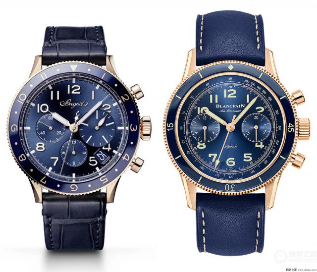 宝玑玫瑰金壳 TYPE XX(左)和宝珀金壳空军司令(右)
