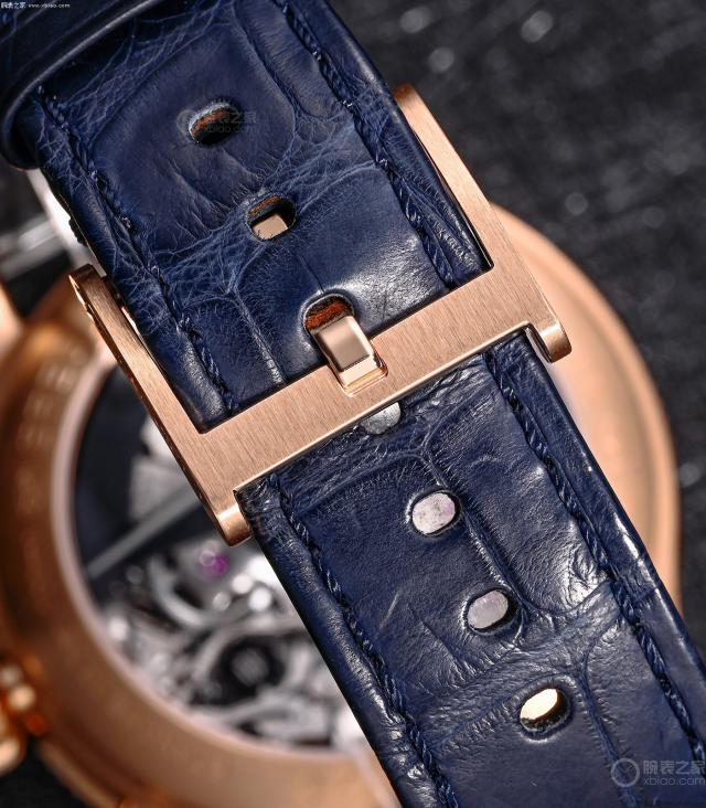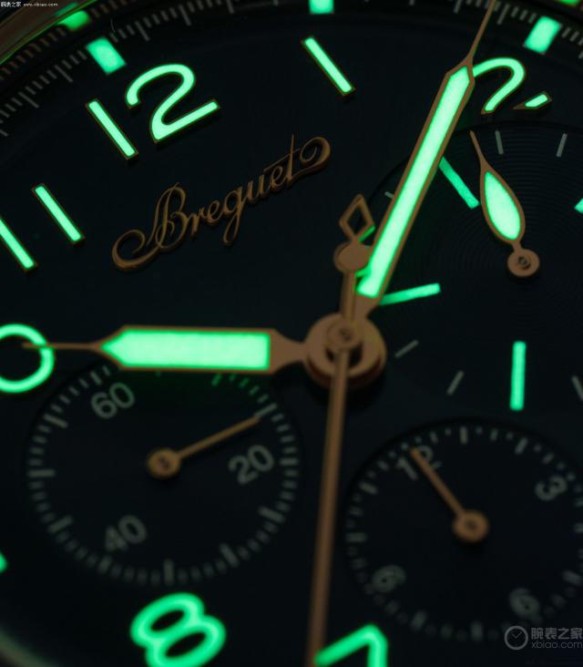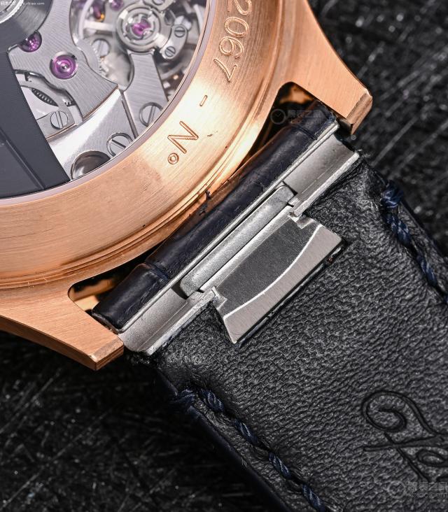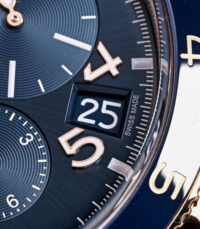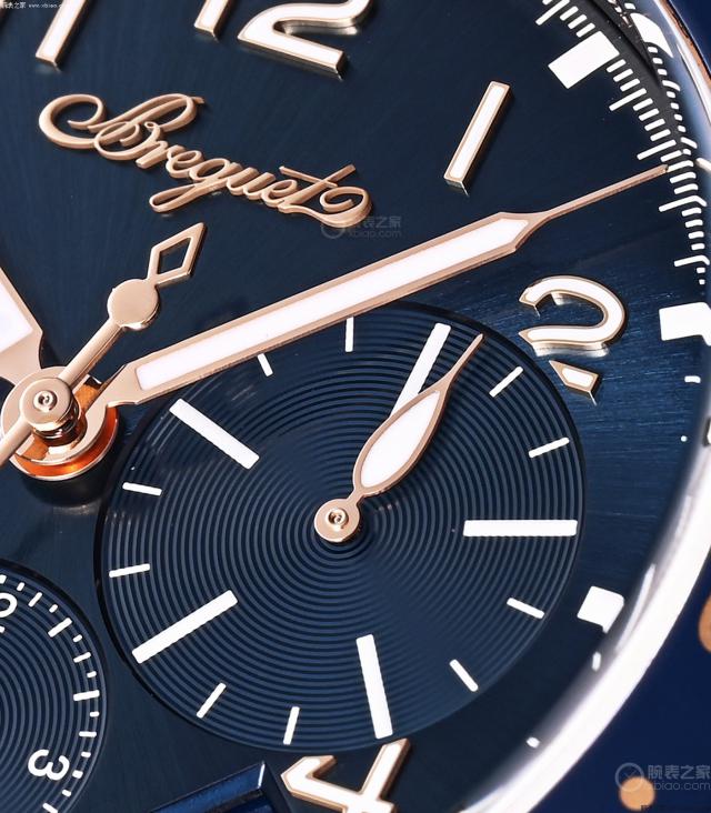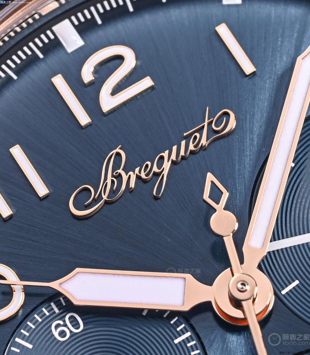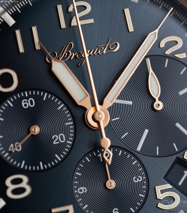 玫瑰金壳 TYPE XX 与钢相比,盘面也发生了很大的变化。首先,金壳 TYPE XX 用注射器指针代替指针。在古董中当然是如此 TYPE XX 在这些版本中,还有注射器指针,出处可循。宝玑英语LOGO在盘面上、数字化时标,全是立体金标金字。中央记时秒针尾部的镂空菱格,记时盘上的唱片纹,从盘面中央四散的放射纹,都为这款手表的细节增添了不少色彩。日历窗在 4 点位,这在名表中很常见,但是 SWISS MADE 写在 4 点位,极为罕见。