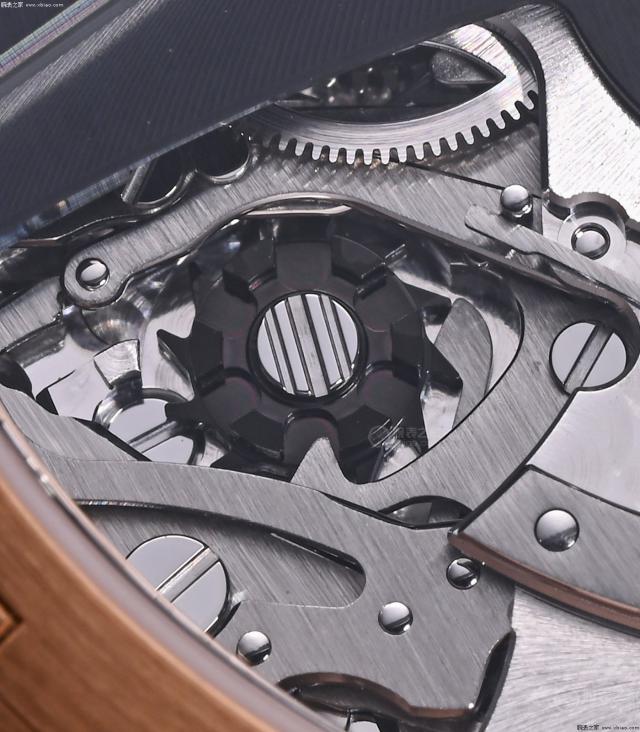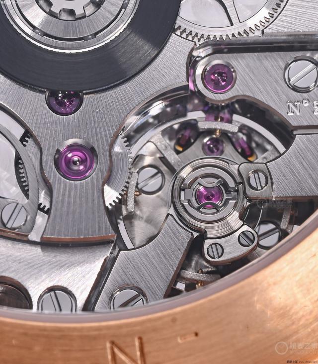 一般而言,使用垂直离合机构的计时机芯,由于夹板遮挡,看不到记时机构运转,而宝玑 728 计时机芯,通过外露柱轮的联动杠杆,提高了机芯的观赏价值。黑镂空自动陀,其实也是全金的(镀黑)。