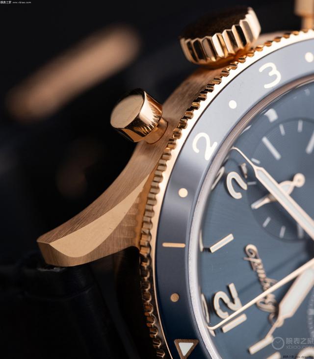 玫瑰金壳 TYPE XX,尺寸依旧是 42 mm,厚 14.1 mm。更换玫瑰金壳后,以前钢壳飞行表的“工具感”一扫而光,不得不承认,玫瑰金 / 金子的豪华感,的确是不锈钢无法比拟的。尽管玫瑰金 TYPE XX 表壳,仍以大规模拉丝为主,但细节处理十分到位。咱们看看表耳,扭转角度的抛光面,造型细致到位。第二,完全抛光的表把、记时按钮,不但与拉丝表壳形成对比,而且还再现了古董表的风格。