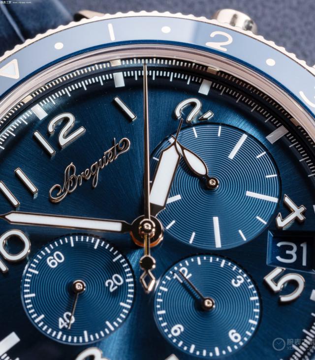 宝玑新金壳 TYPE XX,与钢壳版本相比,外观最大的变化就是加上瓷圈,这也是宝玑第一次使用瓷圈。蓝瓷圈, 12 小时 K 黄金的数字刻度,其中 12 倒三角点也有夜光。