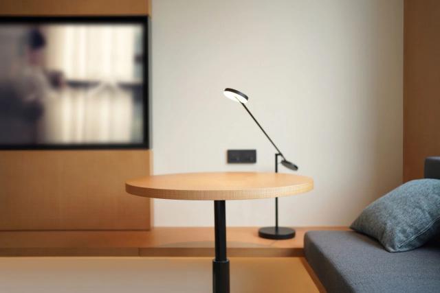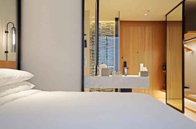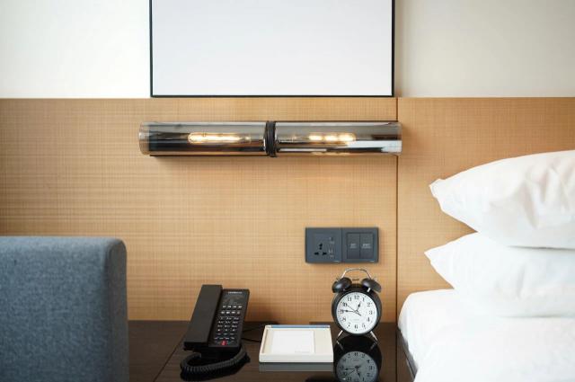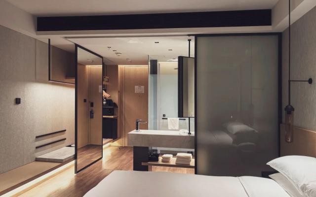 一个代表性的细节就是“条形”——酒店整体设计多采用鲜明的横平竖直现代简约线条感;大堂公区承载 logo 艺术设备的长桌子和客房走廊的大理石条凳;客房里的沙发、行李架和电视储物架都是长条形设计,没有抽屉和橱柜,就像一个大商店。一切一目了然,井然有序。入住客户不但可以轻松找到各种必需品,而且由于空间缺乏距离感,人在其中也更加轻松自洽。