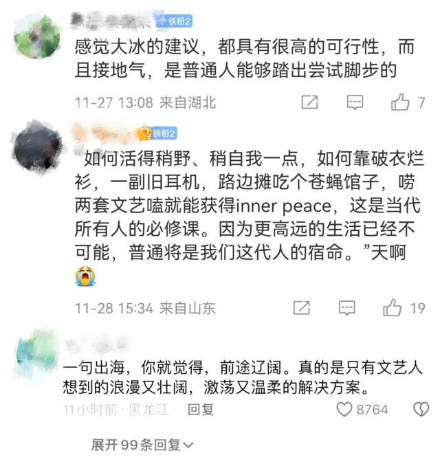 面临着想要自杀的人 20 年轻人,他说"吃一碗回面,然后出海"。面临着“种小麦后往南走”的阿姨,大冰也是切实给出了建议,还精心安排好朋友一路陪伴,帮助她实现梦想。
