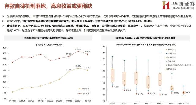 2025 除有明显的货币政策支持外,年债市存款自律机制落地后,高息收益资产可能更加稀缺。我们整理了一下,货币基金、银行理财、保险都是大存款人。在货币基金中, 30%-40% 大类资产是存款,财务管理是存款, 20%-30% 大类资产是存款。而且这些存款的收益率在 2024 今年上半年已超过 50% 上述信用债券。明年新增存款利率将下降,同时也面临着存量到期后再配置的压力。
