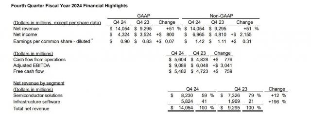 12 月 13 日本,美国芯片制造商博通公司发布 2024 财年第四季度财务报告,第四季度收入达到 140.5 亿美元,同比增长 51%。净利润为 43.2 一亿美元,合每股 90 与去年同期相比,元 35.2 亿美元或者每股 83 元增长 23%。