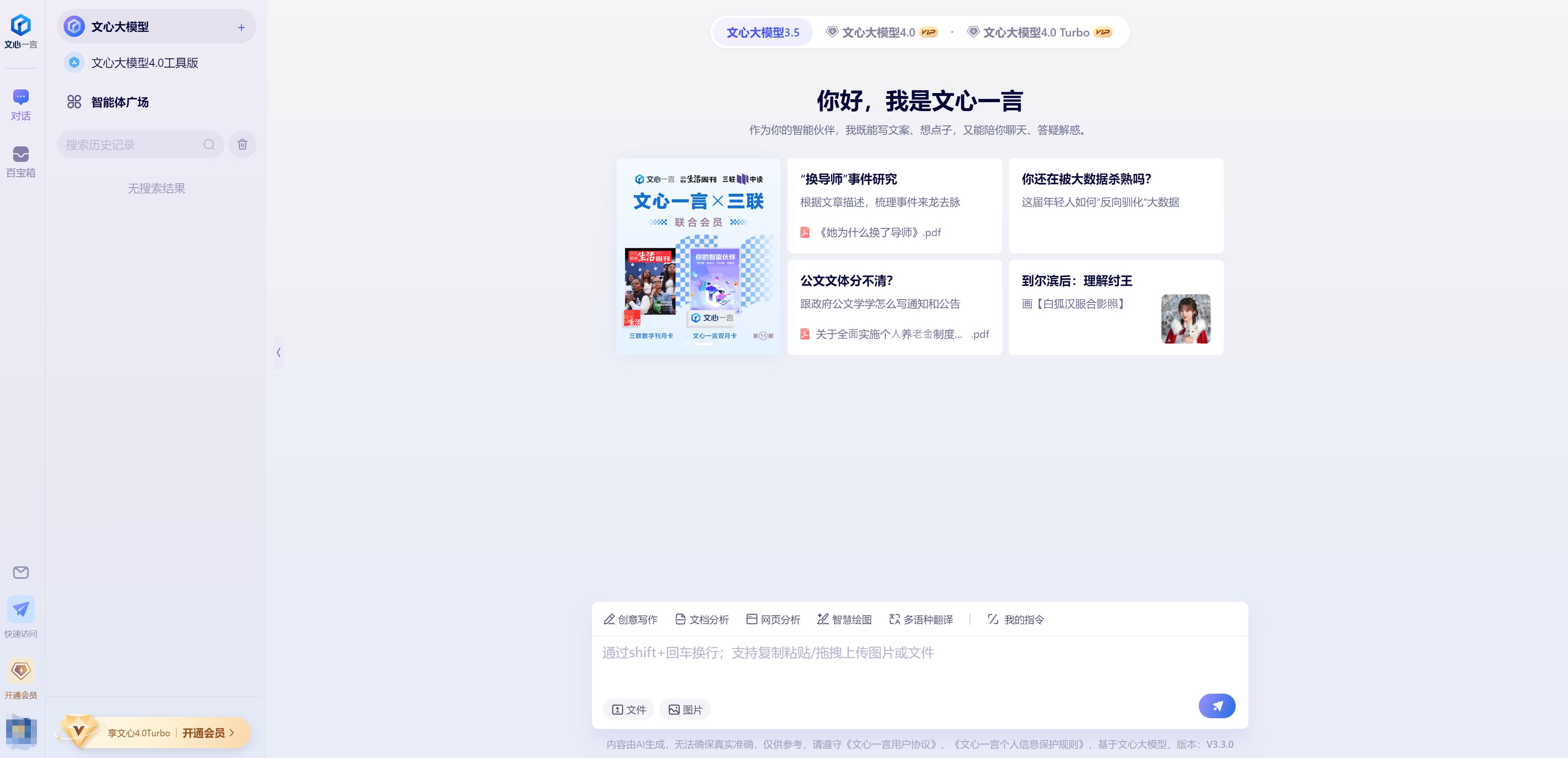 经过多次迭代,文心大模型的功能越来越丰富,文心大模型3.5/4.0/4.0相继推出。 Turbo,还有很多版本,比如文心大模型4.0工具版。到目前为止,文心大模型已经支持输入文字、照片、网页、PDF等不同模式的信息,可以导出文字、图片等各种模式的信息。