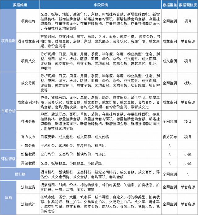 ● 2300 城市房地产数据,225 推出万宗土地交易信息,40 一万个住宅项目和 5 商业物业交易数据万栋;