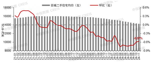 图:2021 年 1 月到 2024 年 11 月百城二手房价格和环比变化