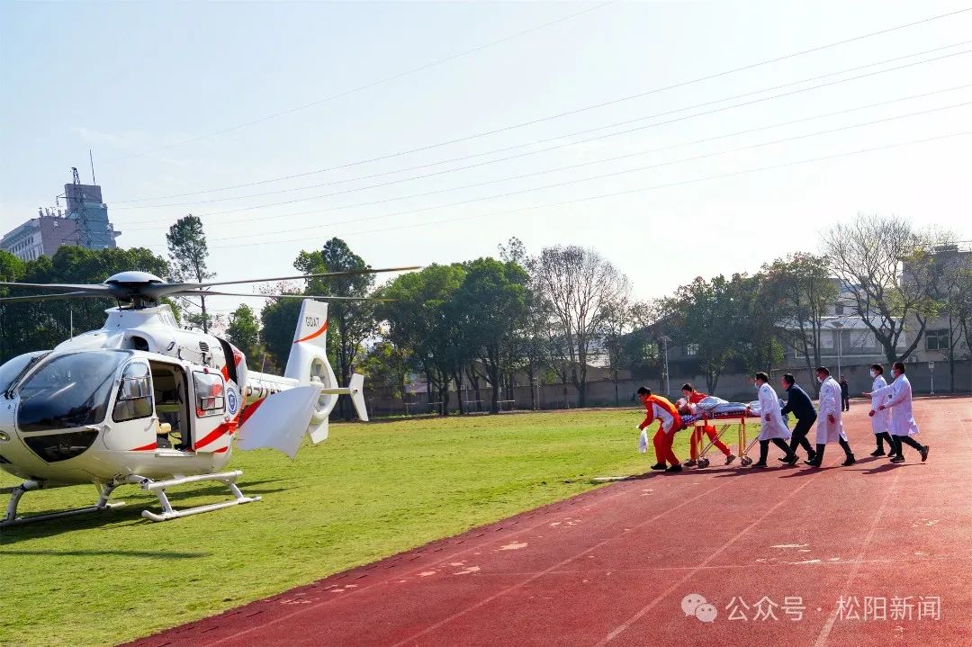 中午12点49分,携带患者的救护车与丽水市人民医院直升机同步抵达松阳市第一中学操场。按照既定的计划,患者在短短几分钟内被迅速转移到直升机上,患者只用了一个多小时就安全抵达了浙江大学第二医院。