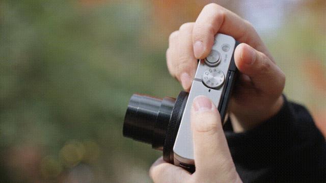 虽然这么小,但是它的焦段已经达到了等效 24-720毫米。整机外观也是类旁轴相机的经典风格。搭配银色机顶,看起来简单复古,真的很适合小狗的心。 ~