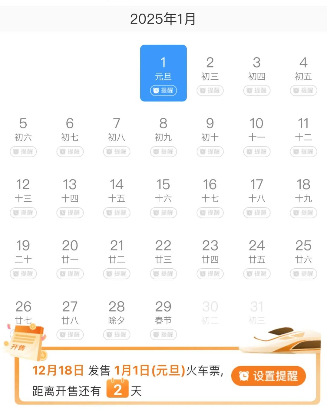 今日(12月18日)可以买到1月1日的票