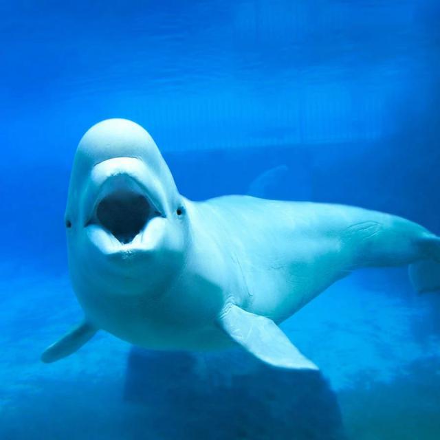 据说热闹的白鲸喜欢社会生活,很多白鲸住在大宿舍,有些小话经常叽叽喳喳。另外,白鲸还会打扮成鬼脸,嘴角似乎总是带着微笑。它的嘴又短又宽,向下弯曲,嘴巴周围可以起皱,面部情绪非常丰富。有时候,它会撅起嘴,就像吹哨子一样。