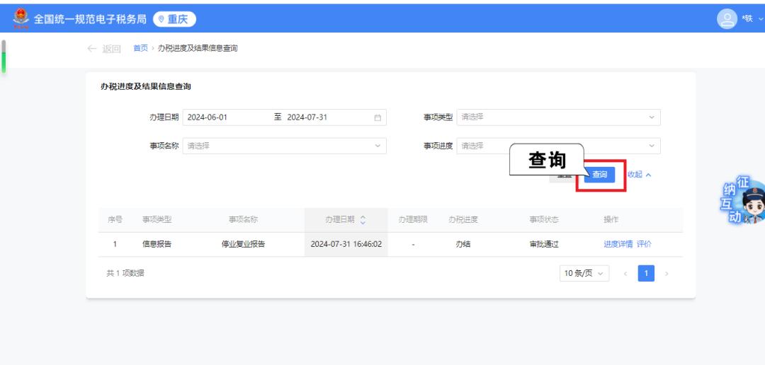 3.点击【税务进度及结果信息查询】,跳转到查询界面,选择相应的处理日期、事件类型等信息,点击【查询】查看事项处理情况。