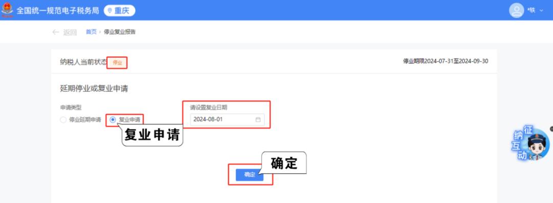 进入【关闭复工报告】功能页面。关闭期满前,纳税人目前的状态默认为“关闭”。可以点击【复工申请】设置复工日期,点击【确定】。如果复工日期选择当天,完成后即可复工;如果复工日期选择当天,只有选定日期后才能复工。