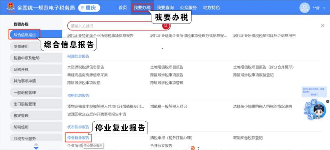 登陆重庆市电子税务局,依次点击【我要办税】-【综合信息报告】-【停业复业报告】进入功能页面。